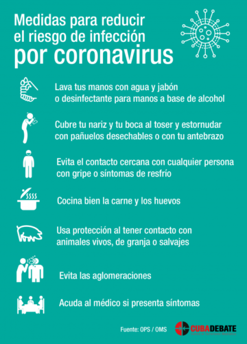 Estamos hablando —aseveró— de policlínicos y hospitales provinciales, e insistió en que ante cualquier riesgo epidemiológico, sobre todo luego de tener contacto con alguien que haya venido de alguna de las cinco naciones que hoy están identificadas por tener una trasmisión sostenida (China, Irán, Corea del Sur, Italia y Japón) hay que acudir de inmediato al médico de la familia y al área de salud.