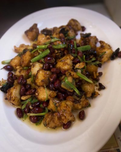 – Pollo con maní al estilo Gongbao. Es un plato típico de la provincia Sichuan —territorio natal del chef Chen-—, y se caracteriza por su sabor picoso y por el toque de ese fruto seco que el cubano suele consumir gustoso.