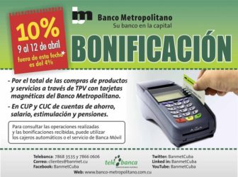 Del 9 al 12 de abril, el Banco Metropolitano ofrece una bonificación del 10 por ciento por el total de las compras de productos y servicios a través de TPV con tarjetas magnéticas del banco de la capital cubana en CUP y CUC de cuentas de ahorro, salario, estimulación y pensiones. Fuera de esa fecha, la bonificación será del 4 por ciento.