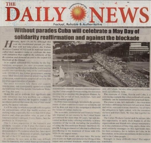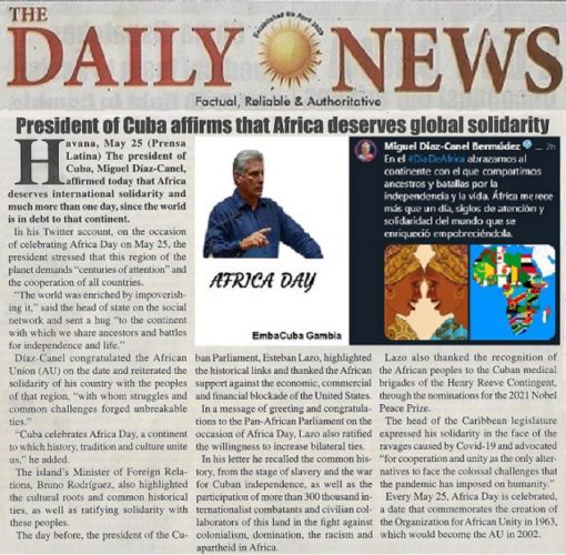 Los diarios gambianos The Point y Daily News publicaron este miércoles un llamado de la Central de Trabajadores de Cuba (CTC) a protagonizar una intensa campaña internacional contra el bloqueo que le impone EE.UU. a la mayor de las Antillas, en ocasión del venidero Primero de Mayo.