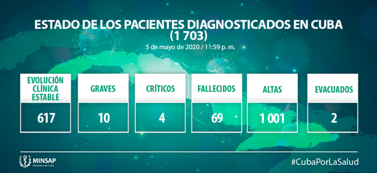 De los mil 703 pacientes diagnosticados con la enfermedad, 631 se mantienen como casos activos y 617 presentan evolución clínica estable. Se reportan 69 fallecidos (ninguno en el día), dos evacuados y 1001 altas (47 en el día de ayer). Se reportan cuatro pacientes en estado crítico y diez pacientes en estado grave.Pacientes reportados en estado crítico:- Ciudadana cubana de 77 años, procedente del Hogar de Ancianos de Villa Clara. Antecedentes de Demencia senil. Se recibe en Terapia Intensiva con cuadro de insuficiencia respiratoria y deshidratación importante, se constata fractura de clavícula derecha. Se encuentrase afebril, con secreciones bronquiales espesas, pobre esfuerzo inspiratorio, ventilación mecánica a través de traqueotomía. Hemodinámicamente estable. Rx tórax con mejoría radiológica. Continúa reportada en estado crítico.