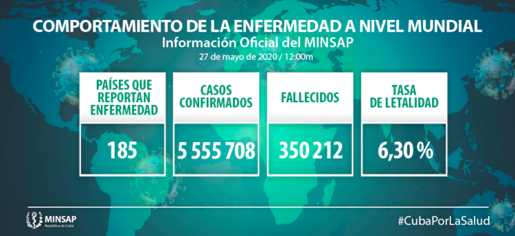 - Ciudadano cubano, de 52 años, del Municipio Habana del Este. Antecedentes de Hipertensión arterial, VIH positivo con 20 años de evolución, asma bronquial. Ingresó en Terapia Intensiva por presentar empeoramiento de su cuadro clínico. Comenzó con tos seca, falta de aire y fiebre. Se encuentra estable, afebril, ventilando espontáneamente. Estable hemodinámicamente. Rx de tórax. con discreta mejoría. Lesiones inflamatorias en ambos campos pulmonares a predominio de los 2/3 inferiores del pulmón izquierdo y el lóbulo medio del pulmón derecho. Se reporta en estado grave.Hasta el 27 de mayo se reportan 185 países con casos de COVID-19, con 5 millones 555 mil 708 casos confirmados (+ 96 mil 180) y 350 mil 212 fallecidos (+ 4 mil 218) con una letalidad de 6,30% (-0,03).En la región de las Américas se reportan 2 millones 571 mil 974 casos confirmados (+ 53 mil 122), el 46,29% del total de casos reportados en el mundo, con 149 mil 023 fallecidos (+ 2 mil 632) para una letalidad de 5,79% (-0,02).