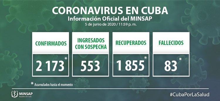 Como cada mañana, el reconocido especialista ofreció las estadísticas actualizadas sobre la pandemia en Cuba, donde hasta las 12 de la noche del 5 de junio se reportaban 553 ingresados , de ellos 312 sospechosos, 233 confirmados, en vigilancia 8 personas y 1 817 se mantienen bajo vigilancia en la atención primaria de salud.