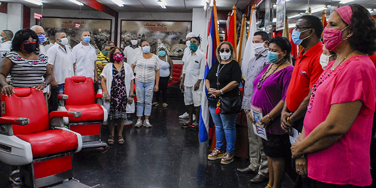 En nombre de la dirección de la organización sindical, Ramón Delgado González, destacado barbero con extensa trayectoria laboral, entregó a Alina Martínez Triay, subdirectora del periódico Trabajadores, un cuadro con la imagen del Comandante en Jefe, en ocasión de cumplirse 50 años de la fundación de ese órgano de prensa, el 6 de junio de 1970.