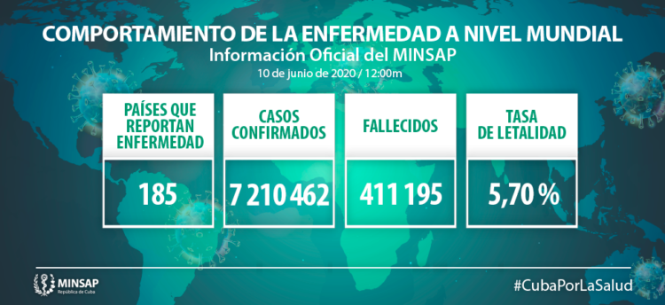 Hasta el 10 de junio se reportan 185 países con casos de COVID-19, se reportan 185 países con casos de COVID-19 con 7 millones 210 mil 462 casos confirmados (+141 mil 184) y 411 mil 195 fallecidos (+ 5 mil 608) para una letalidad de 5,70% (-0,04).