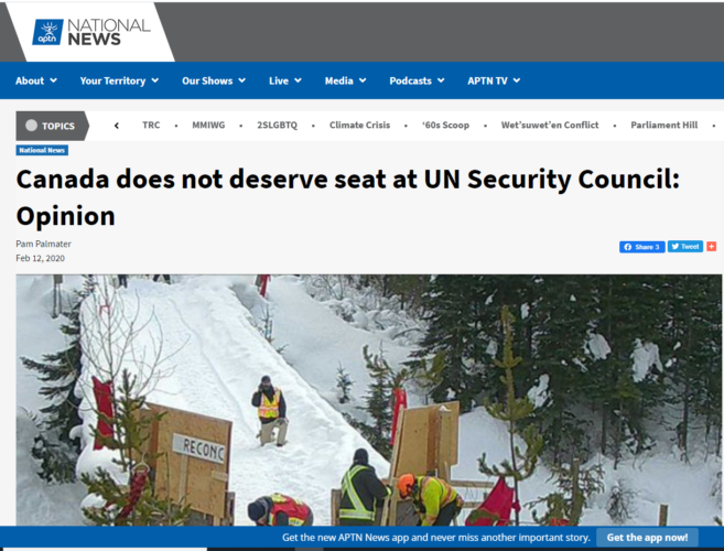 Esta consideración incluso se hizo visible en editoriales de medios corporativos que abordaban la derrota. También bajo escrutinio en la debacle del Consejo de Seguridad de Naciones Unidas se ha mencionado el incumplimiento del derecho internacional y las resoluciones de Naciones Unidas por parte del gobierno de Trudeau.