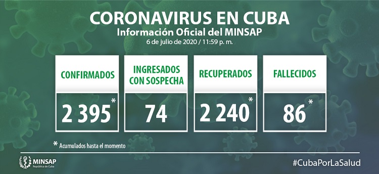 De los 2 mil 399 pacientes diagnosticados con la enfermedad, se mantienen ingresados confirmados 69 (2,8%) y de ellos 65 el 94,2% con evolución clínica estable. Se reportan 86 fallecidos (ninguno del día), dos evacuados y se acumulan 2 mil 242 pacientes recuperados (2 en el día de ayer). Se reportan cuatro pacientes en estado grave.