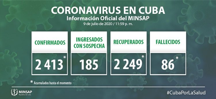 De los 2 mil 413 pacientes diagnosticados con la enfermedad, se mantienen ingresados confirmados 76 (3,1%), de ellos 74 el 97,4% presentan evolución clínica estable. Se reportan 86 fallecidos (ninguno del día), dos evacuados y 2 mil 249 pacientes recuperados (93,3 %) (cinco altas del día). Se reportan dos pacientes en estado grave.