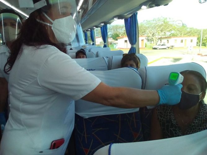 La toma de temperatura por profesionales de la Salud a los trabajadores antes de bajarse de los ómnibus, la preparación de soluciones para el lavado de las manos, entre otros protocolos, pudieron ser comprobados durante el recorrido por áreas como las tiendas y puntos de ventas, reportó la página web de Radio 26, la a radio provincial de Matanzas.