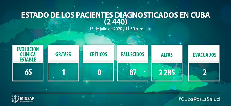 De los 2 mil 440 pacientes diagnosticados con la enfermedad, se mantienen ingresados confirmados 66 (2,7%), de ellos 65 el 98,5% con evolución clínica estable. Se reportan 87 fallecidos (ninguno del día), dos evacuados y 2 mil 285 pacientes recuperados (94%) (ocho altas del día). Se reporta un paciente en estado grave.