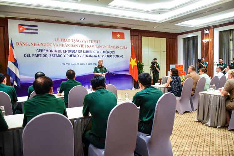 Con un peso superior a las dos toneladas, y valorado en medio millón de dólares, el donativo vietnamita incluye kits de diagnóstico de la Covid-19, mascarillas médicas y de tela antibacteriana, trajes de protección y otros insumos médicos.