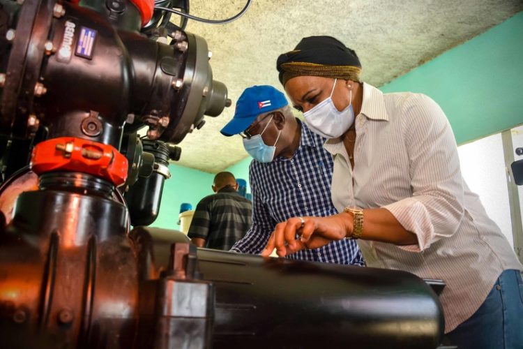 El recorrido por los polos productivos incluyó la visita a las estaciones de bombeo vinculadas especialmente a las áreas cañeras, donde conoció a través de Reina Salermo, directora de la empresa azucarera de Holguín, la marcha de las inversiones en las máquinas de riego mediante la técnica de goteo, donde el agua y los nutrientes caen directamente en las raíces de la gramínea.