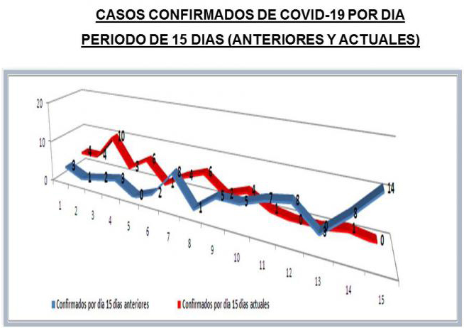 Existen 21 control de focos abiertos, los casos confirmados disminuyen en más de 20 con relación con los 15 días anteriores, quedan capacidades de camas en los centros hospitalarios y de aislamiento, está reportado un paciente como crítico, y se mantienen 192 profesionales de la salud afectados por la pandemia; en el día no se reportan trabajadores de la salud confirmados con fuente de infección institucional.