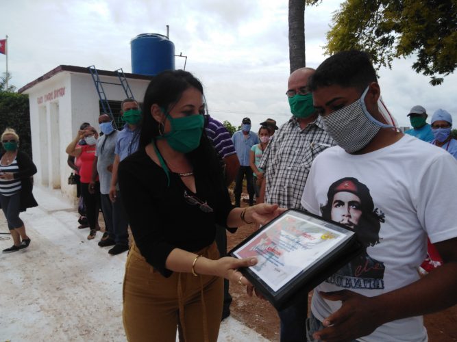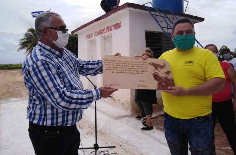 Entregaron el estímulo Néstor Bárbaro Hernández Martínez, secretario general del Sindicato Nacional de Trabajadores Agropecuarios, Forestales y Tabacaleros (SNTAFT), y Héctor Benítez Mora, secretario general de la CTC en el territorio avileño.