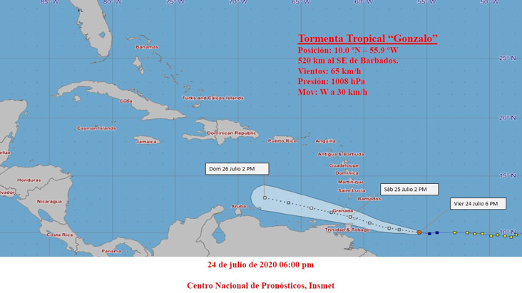 El Instituto de Meteorología informó hoy que la tormenta tropical Gonzalo se ha debilitado, pero puede convertirse en huracán en el Atlántico occidental.