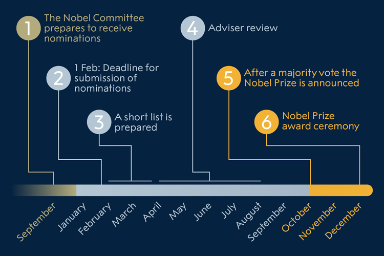Los Estatutos del Premio establecen una estricta cronología para la nominación: en septiembre se envían las cartas de invitación a miembros de asambleas nacionales, gobiernos y tribunales internacionales; rectores; profesores de ciencias sociales, historia, filosofía, derecho y teología; dirigentes de los institutos de investigación de la paz y los institutos de relaciones exteriores; anteriores laureados del Premio Nobel de la Paz; miembros de los Consejos de organizaciones que han recibido el Premio Nobel de la Paz; a los miembros del Comité Nobel Noruego presentes y pasados; y ex asesores del Instituto Nobel Noruego.