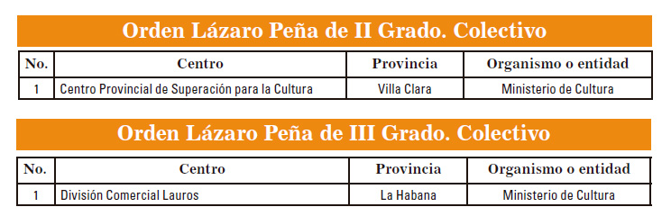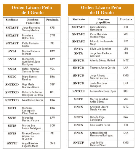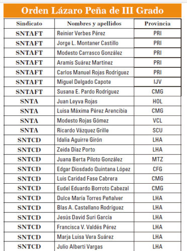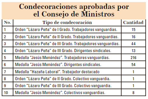 La Central de Trabajadores de Cuba conmemora por estos días el aniversario 67 de los asaltos a los cuarteles Moncada y Carlos Manuel de Céspedes, y condecora con las Órdenes Lázaro Peña en sus distintos grados, y con las medallas Jesús Menéndez y Hazaña Laboral a más de 300 trabajadores, colectivos y dirigentes sindicales, a la vez que entrega la Bandera de Vanguardia Nacional a un grupo de centros laborales, todos con sobresalientes resultados en el cumplimiento de sus compromisos productivos, investigativos y de servicios en el país durante el 2019.