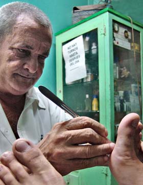 “Alivio de los pies, consuelo del alma. Con esa frase tomada de su bisabuelo inicia Aniceto su tertulia Tradiciones habaneras para deleitar a los asistentes con la historia de la Podología en Cuba. Este encuentro habitual el tercer miércoles de cada mes fue creado por el periodista e historiador ya fallecido Eduardo Robreño en La acera del Louvre, en compañía de nuestro entrevistado, quien lo ha continuado y desde hace dos años lo realiza en la Casa Juan Gualberto Gómez, ubicada también en su entrañable Habana Vieja”.