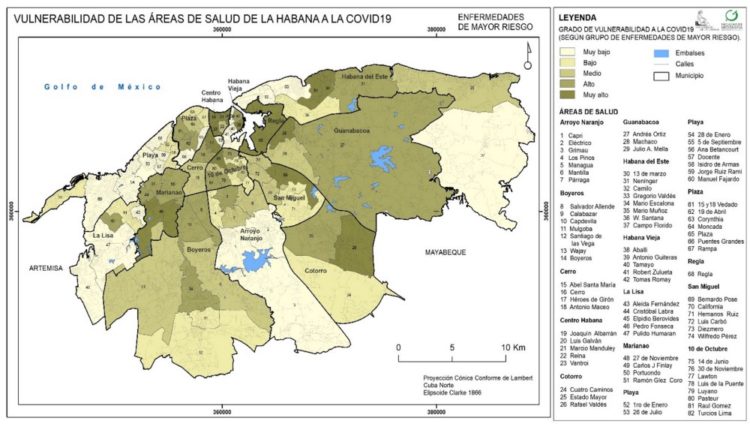 La investigación señala entre las zonas de vulnerabilidad muy alta las áreas de salud de los municipios Centro Habana, La Habana Vieja, Cerro, Regla y Diez de Octubre, Plaza de la Revolución, Regla, norte de Marianao, Boyeros y San Miguel del Padrón, y extremo occidental de Guanabacoa.