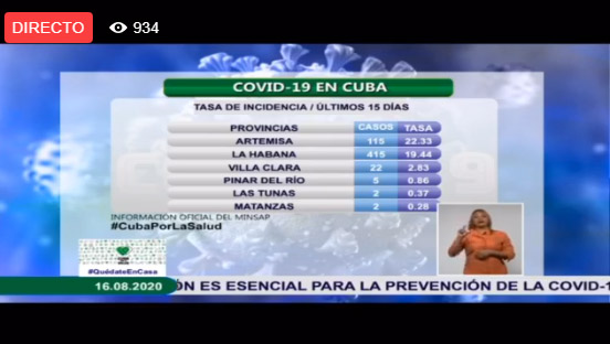 La tasa de Cuba es de 27, 9 por cada 100 mil habitantes. En las últimas semanas Artemisa, La Habana, Villa Clara, Pinar del Río, Las Tunas, Matanzas y Mayabeque, son las provincias que mantiene tasa de incidencia. Se mantiene abiertos 11 eventos de transmisión.