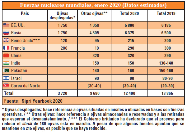Según el anuario de Sipri (Yearbook 2020), a inicios de este año los nueve países dotados de armamento nuclear —EE. UU., Rusia, Reino Unido, Francia, China, India, Pakistán, Israel y la República Popular Democrática de Corea (RPDC)— poseían un total de 13 mil 400 armas nucleares (465 menos que un año antes), alrededor de 3 mil 720 de ellas se encuentran desplegadas en fuerzas operativas y casi mil 800 en alerta permanente.
