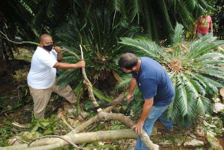 Con un Triplay Americano, conocido como árbol hormiguero de años en este lugar, que cayó encima de una Cycas revoluta, se bate —junto a otros— Alexey Revol Soroa, jardinero del área de Reproducción, pues afectó estructuras de jardinería por el grueso de sus ramas y la altura de su tronco.