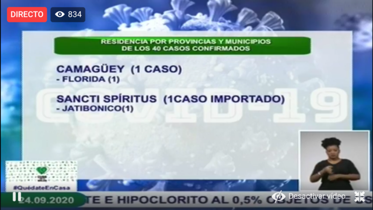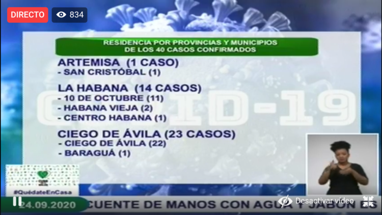 - Ciudadana cubana de 41 años de edad, residente en el municipio Baraguá, provincia Ciego de Ávila. Contacto de caso confirmado anteriormente. Se mantienen en vigilancia 11 contactos.