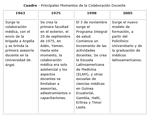 La primera de esas misiones docentes acudió a la República Argelina Democrática y Popular, en 1969. Un lustro antes habían llegado allí 31 médicos, 15 enfermeras y auxiliares, 4 estomatólogos y 8 técnicos, personal que sentó las bases para los profesores que laboraron luego en la Facultad de Medicina de Orán y en el Instituto Tecnológico de la Salud de Mostaganem.