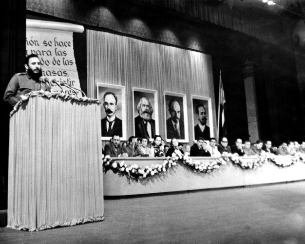 Con su uniforme de campaña Fidel Castro se paró ante el podio ubicado en el entonces Teatro Chaplin, hoy Karl Marx, en La Habana. Se celebraba allí el acto solemne donde quedaba constituido el Primer Comité Central del Partido Comunista de Cuba.