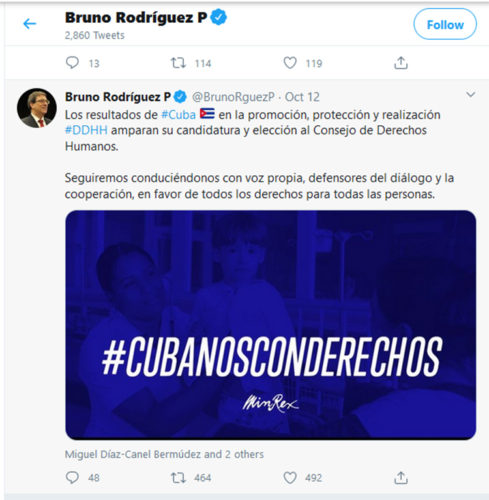 “Los resultados de Cuba en la promoción, protección y realización de los derechos humanos amparan su candidatura y elección al Consejo de Derechos Humanos”. Así lo aseguró el canciller cubano Bruno Rodríguez Parrilla, este lunes en su cuenta en Twitter, jornada en que se presentó ante ese órgano de las Naciones Unidas, la candidatura de la Mayor de las Antillas para formar parte de él para el periodo 20201 -2023.