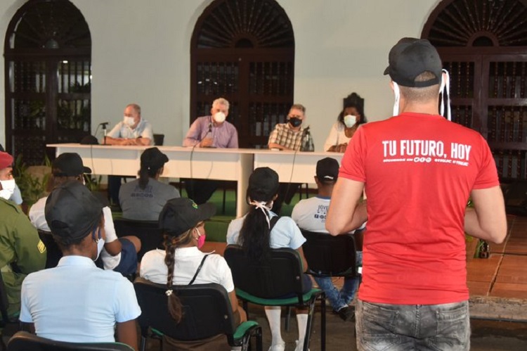 En horas de la tarde de este jueves, el Presidente Díaz-Canel, según informa @PresidenciaCuba, asistió a un intercambio con jóvenes de distintos sectores que han participado en tareas de enfrentamiento a la COVID-19 en esa Ciudad Héroe, y también visitó el polígono “Barquillo”, en la avenida Patria.