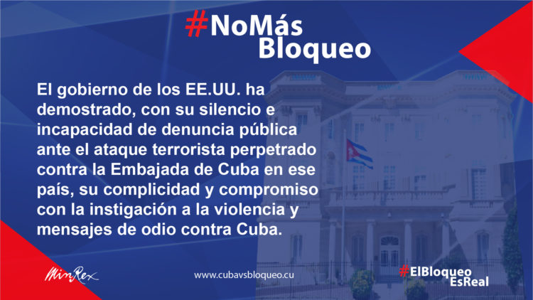 El documento menciona el ataque terrorista perpetrado contra la Embajada cubana en EE.UU. el 30 de abril de 2020, acto seguido del silencio cómplice del gobierno norteño, que según el informe, evidencia el compromiso de la Casa Blanca con la instigación a la violencia y los mensajes de odio contra Cuba y sus nacionales.