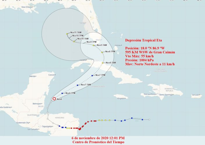 De acuerdo con la información del Centro de Pronóstico del Instituto de Meteorología la Depresión Tropical Eta ganará en organización e intensidad. En su aproximación a los mares al sur de Cuba, se incrementarán las lluvias en gran parte del archipiélago, que pueden ser fuertes e intensas, incluso en zonas alejadas del centro.