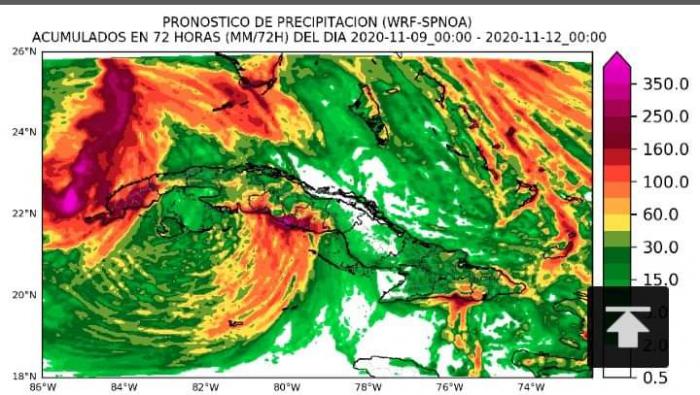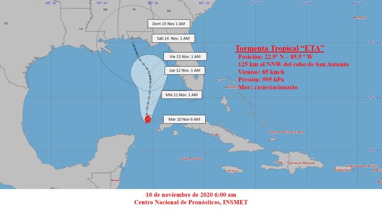 La tormenta tropical Eta se aleja lentamente de Cuba, pero sus bandas de nublados siguen incidiendo sobre la provincia Pinar del Río. En las últimas horas los acumulados de lluvias más significativos se reportan en San Juan y Martínez con 160 milímetros (mm), 138 en Isabel Rubio, Guane y 135 en Paso Real de San Diego, en Los Palacios.