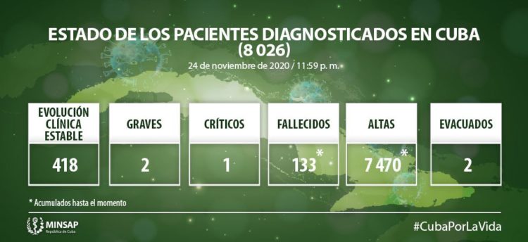 - Ciudadano cubano de 24 años del municipio Songo La Maya, provincia Santiago de Cuba. Contacto de caso confirmado anteriormente. Se mantienen en vigilancia 8 contactos.