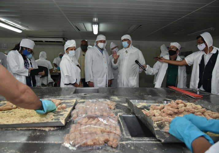 Ya en Gerona, el Presidente de la República estuvo en la Empresa Pesquera Industrial Pesca Isla, que comercializa la langosta en diferentes surtidos, también el pepino de mar, la tenca, la claria, entre otros. Al recorrer sus áreas de producción, el Presidente Díaz-Canel conoció sobre los variados surtidos que se venden a la población, en conformados de croquetas, albóndigas, hamburguesas, embutidos y filetes.