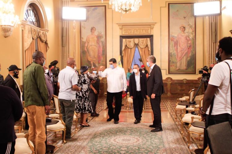 Maduro saludo en el también conocido como Palacio del Pueblo a delegaciones de EE.UU., Rusia, Irán, África y eurodiputados, en un encuentro en el que aseguro que son más los que quieren paz, dialogo, encuentro y respeto para la autodeterminación de la nación suramericana.