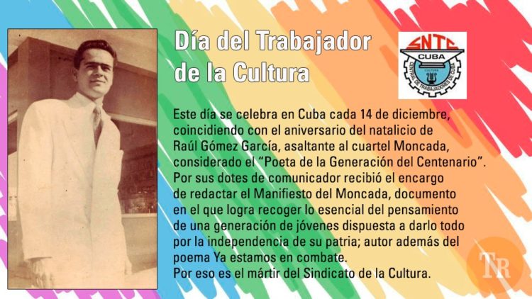 Los trabajadores de la cultura celebran su día este 14 de diciembre en recordación del aniversario 92 del natalicio de Raúl Gómez García, asaltante y mártir del Moncada, conocido como el Poeta de la Generación del Centenario.