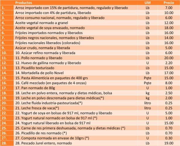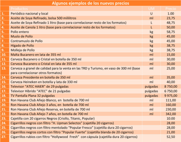 De acuerdo con Díaz Velázquez, se ha tratado de homologar una tablilla de precios, aún cuando está publicada en Gaceta, que permitirá al consumidor visualizar en la bodega (hay más de 12 000 en el país) los nuevo precios de los productos.
