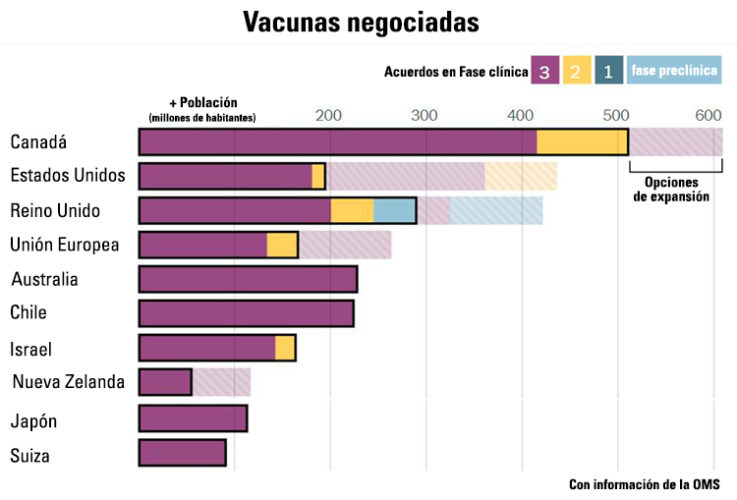 Un estudio publicado por The New York Times, basado en los contratos colectados por la Universidad de Duke, Unicef y Airfinity (empresa que analiza datos científicos), reveló que las naciones ricas han negociado con ventaja enormes dosis de vacunas aún no fabricadas. Si la Unión Europea, por ejemplo, recibiera todas las dosis pedidas, podría inocular dos veces a sus residentes, el Reino Unido y Estados Unidos podrían hacerlo cuatro veces, y Canadá seis veces.