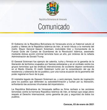 El Gobierno Bolivariano de Venezuela emitió en un comunicado oficial un saludo al pueblo y los líderes de la Republica Islámica de Irán quien rinde tributo este domingo al mártir Mayor General Qasem Soleimani, líder y Comandante de la Fuerza Quds del Cuerpo de Guardianes de la Revolución Islámica.