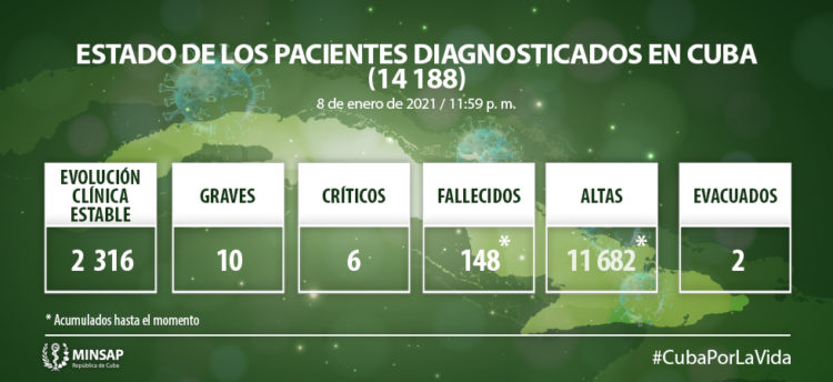 Al cierre de ayer, 8 de enero, Cuba reportó 365 nuevos casos de COVID-19, ningún fallecido y 151 altas médicas, según la información ofrecida por Francisco Durán García, director de Epidemiología del Ministerio de Salud Pública (Minsap). Se encuentran ingresados confirmados 2 332 pacientes.