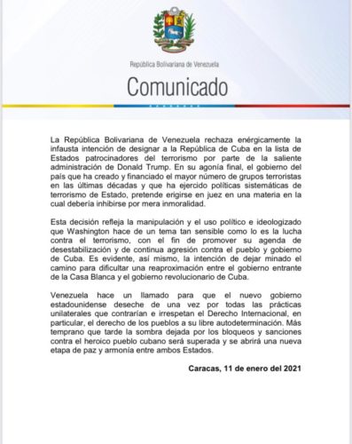 Arreaza compartió en Twitter un comunicado oficial de su cancillería en el que se destaca que tal decisión refleja la decisión y el uso político e ideologizado que Washington hace de un tema tan sensible como lo es la lucha contra el terrorismo, con el fin de promover su agenda de desestabilización y de continua agresión contra el pueblo y el gobierno de Cuba. “Es evidente, así mismo, la intención de dejar minado el camino para dificultar una reaproximación entre el gobierno entrante de la Casa Blanca y el gobierno revolucionario de Cuba”.