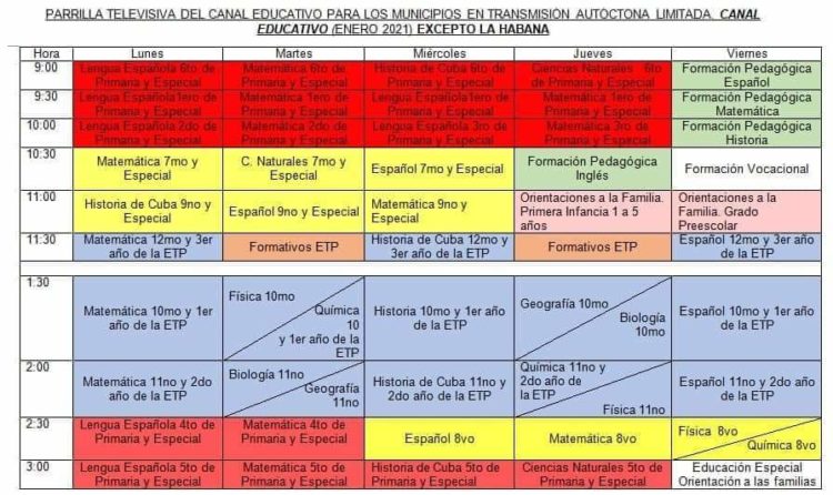 A partir del próximo miércoles 20 de enero comienza la programación de las actividades televisivas por el Canal Educativo de la televisión cubana en los horarios de 9.00 am a 12.00m y de 1.30 pm a 3.30 pm para los municipios en transmisión autóctona, excepto La Habana que transmitirá por el Canal Habana. Así lo informó este viernes una Nota oficial publicada en el sitio web del Ministerio de Educación de Cuba (MINED).