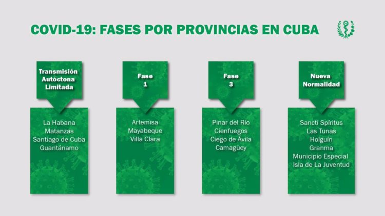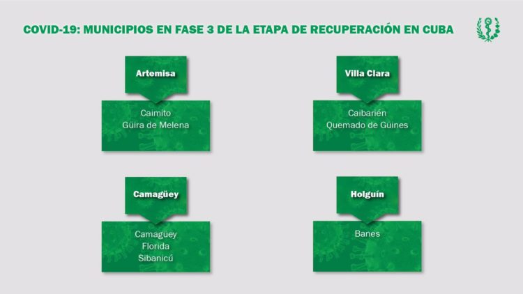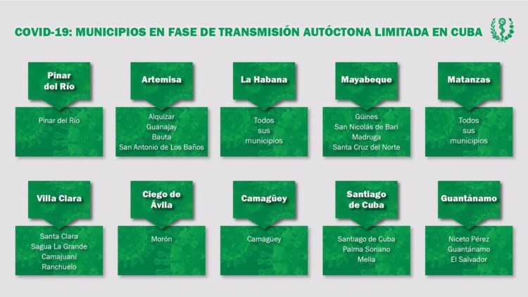 En la Mesa Redonda televisiva de este viernes se confirmó que por decisión del Grupo Temporal de Trabajo, en estos momentos se encuentran en Fase de transmisión autóctona 63 municipios del país, dentro de ellos los 15 de la capital, a los que se sumaron las provincias de Matanzas, Santiago de Cuba y Guantánamo.