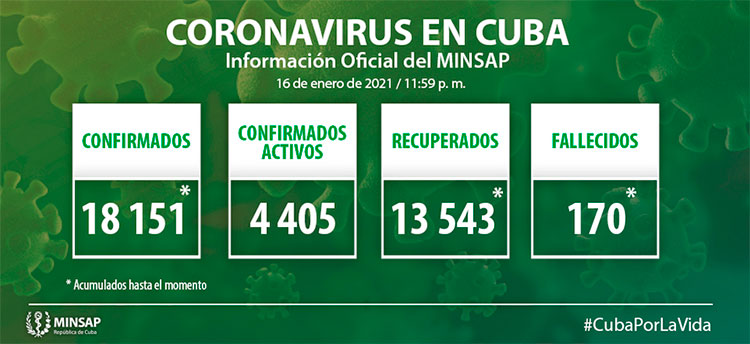 De los 18 mil 151 pacientes diagnosticados con la enfermedad, se mantienen ingresados 4 mil 405, de ellos 4 mil 359 con evolución clínica estable. Se reportan fallecidos 170 (cuatro en el día), dos evacuados, 31 retornados a sus países (uno del día), 363 altas del día, se acumulan 13 mil 543 pacientes recuperados (75,3%). Se atienden en las terapias intensivas 46 pacientes confirmados, de ellos 11 críticos y 35 graves.
