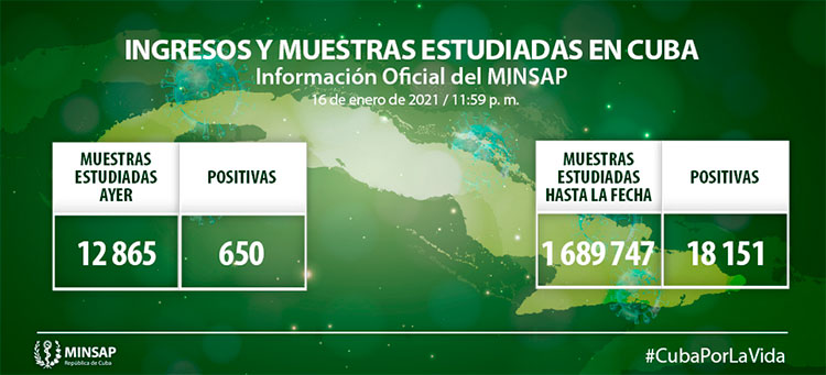 - Ciudadano cubano de 64 años de edad, del municipio Cárdenas, provincia Matanzas. Antecedentes Patológicos Personales: Hipertensión Arterial. Comienza con tos seca y fiebre. No acude a los Servicios de Salud. Es evaluado e ingresado en Sala de sospechosos. Se realiza PCR.El día 12 de enero empeora la disnea, en el Rayos X de Tórax lesiones en ambos campos pulmonares. Se traslada a la Unidad de Cuidados Intensivos, fue iniciada ventilación no invasiva.El día 13 de enero presenta agobio respiratorio e hipotensión arterial, fue intubado, ventilado en modalidad controlada y apoyado con aminas.Los días 14 y 15 de enero presenta empeoramiento clínico, gasométrico y radiológico. Fue necesario elevar dosis de aminas. El día 16 de enero en horas de la mañana, presenta episodios de arritmias ventriculares, hace parada cardíaca en asistolia, fueron realizadas maniobras de reanimación cardiopulmonar que no son efectivas. Es realizada necropsia.Lamentamos profundamente lo ocurrido y transmitimos nuestras más sinceras condolencias a sus familiares y amigos.