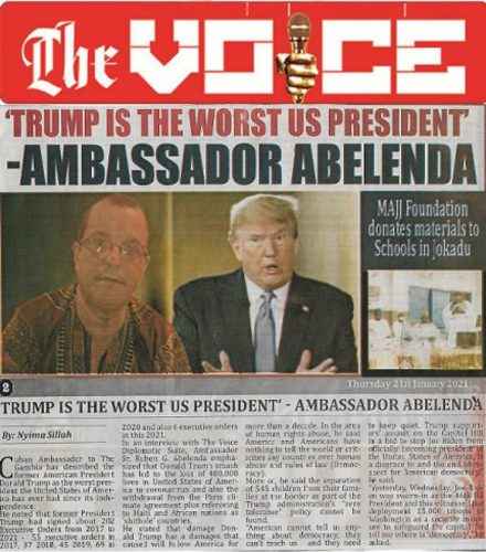 Donald Trump ha sido el peor presidente de la historia de EE.UU., titula este jueves el diario The Voice a la primera parte de una extensa entrevista concedida a ese medio gambiano por el embajador de Cuba en esta nación del occidente africano, Rubén García Abelenda.