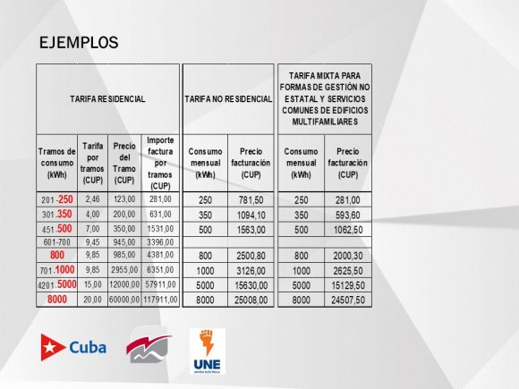 Es decir, “las formas de gestión no estatal que ejerzan su actividad dentro del sector residencial podrán pagar los primeros 250 kWh que consuman en el mes, con el mismo precio que tiene este tramo en la tarifa residencial, y en lo adelante pagarían por el precio que tiene el kWh en la tarifa no residencial, que no está subsidiada, es lineal y además no está estructurada en bloques de consumo y tiene un precio el KWh de 3,26 pesos”.