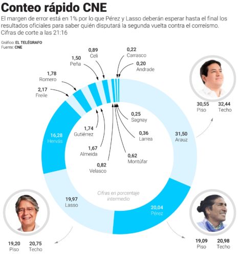 Le siguen en la lista Yaku Pérez, del partido Pachakutik, y Guillermo Lasso, de CREO que en reñida disputa hasta último momento obtuvieron 19.76 % y 19.62 %, respectivamente.